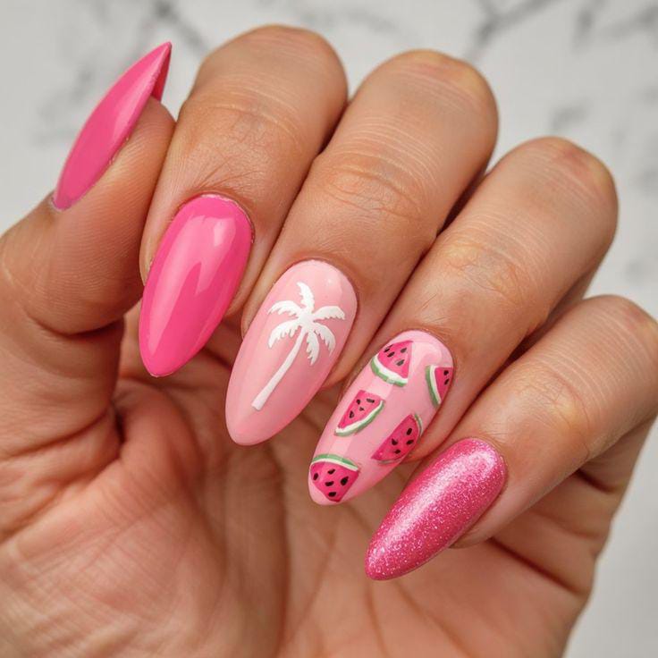 This design features glossy hot pink nails paired with soft blush accents and playful watermelon slices. A white palm tree detail adds a tropical touch, while a subtle glitter nail brings extra sparkle. The overall vibe is bright, flirty, and perfect for a fun summer getaway.