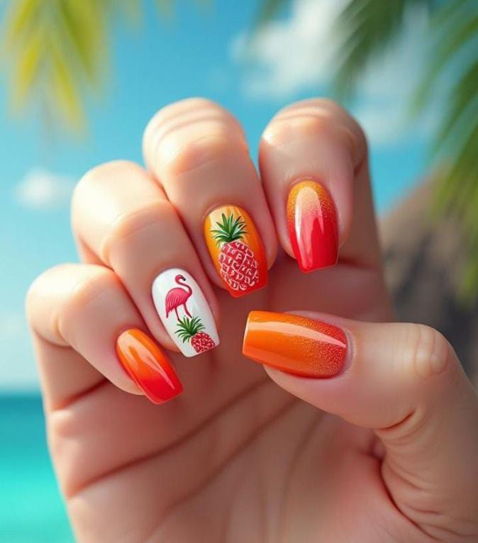 Bold orange and red ombré nails are paired with pineapple and flamingo accents for a true beachy statement. The warm gradient and tropical details create a vibrant, summer vacation-ready look.