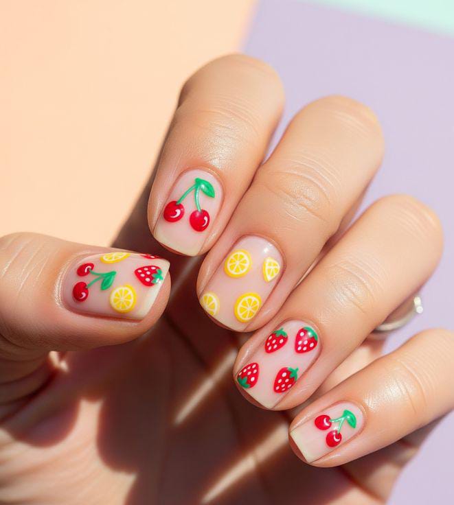 A soft nude base is decorated with tiny cherries, strawberries, and lemon slices for a sweet mixed-fruit theme. The overall look is cute, colorful, and slightly retro, like a fresh summer picnic on your nails.