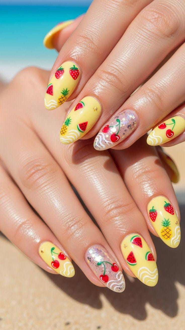 These almond-shaped nails feature a soft pastel yellow base with playful fruit accents like strawberries, cherries, pineapples, and watermelon slices. The glossy finish and subtle white wave and glitter details give it a breezy, beachy summer vibe that feels fresh and cheerful.