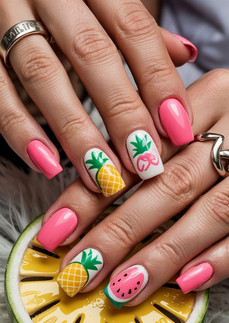 This design features bright pink nails mixed with playful pineapple and watermelon white accent nails. The bold colors and glossy finish give it a fun, tropical summer vibe that feels fresh and eye-catching.