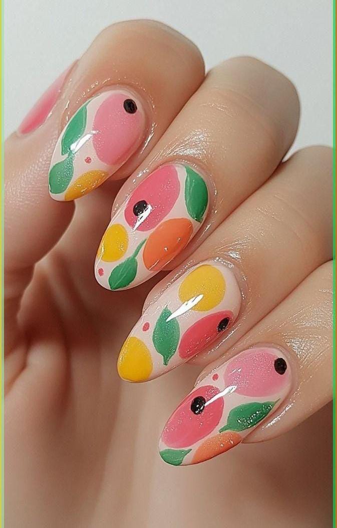 Soft pastel tones blend with abstract fruit shapes, dots and leafy accent cream nails for a modern, artsy look. The design feels playful yet elegant, with a smooth glossy finish that adds a fresh summer charm.