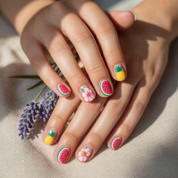 These short nude nails feature tiny watermelon and pineapple designs paired with a soft floral accent. The look is subtle yet cheerful, giving off a light, breezy summer feel with a clean finish.