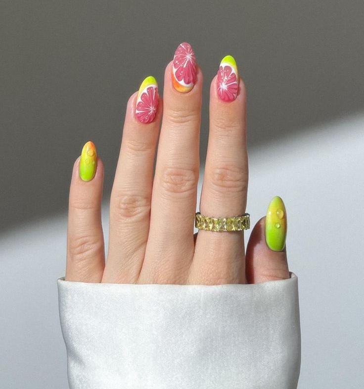 A modern twist on French tips, this look blends neon yellow and pink ombre tones with detailed citrus slice art. The combination of bold color gradients and fruit accents creates a vibrant, sun-soaked summer feel.