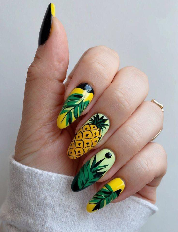 This manicure mixes bright yellow, deep green, and black for a bold tropical statement. With pineapple dot details and leafy patterns, it gives off a confident, vacation-ready island summer aesthetic.