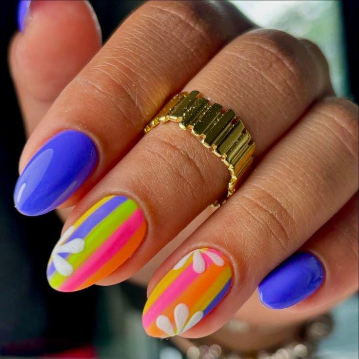 This design mixes soft lavender with bright pink gel nails for a fun, cheerful summer look. The floral nail art adds a cute, retro vibe that feels fresh and youthful without being overdone.