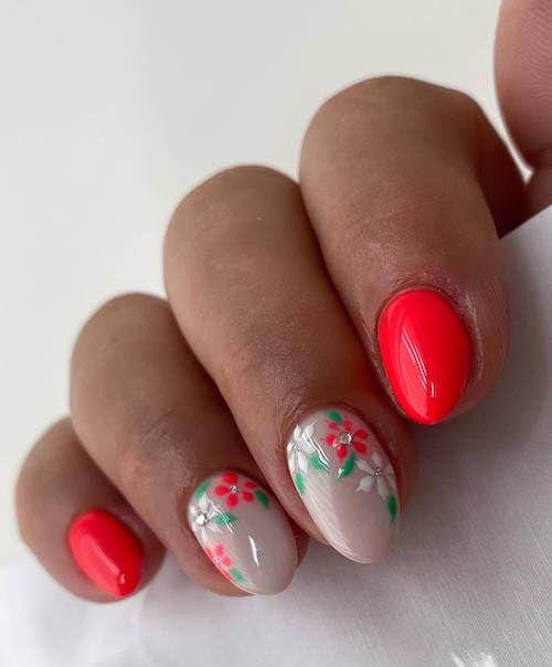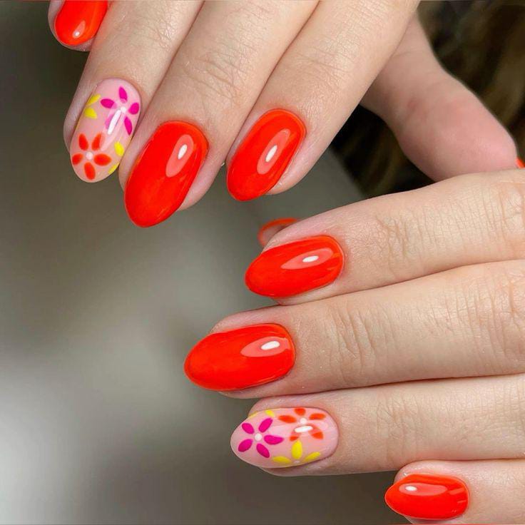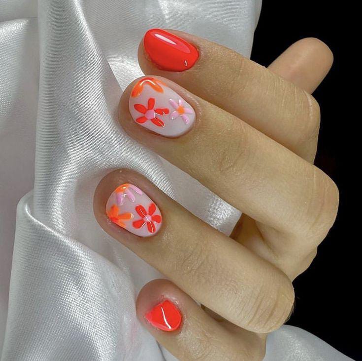 This design features a bold coral-red gel nail base paired with playful floral accents on a soft nude background. The bright colors and glossy finish give it a fresh, cheerful summer vibe that feels fun yet polished.