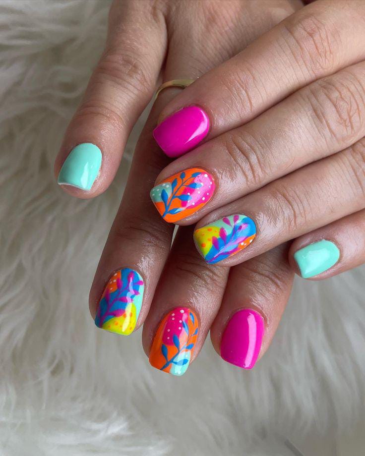 This set combines vibrant pinks, aqua gel nail tones, and neon-inspired leaf patterns and dots for a bold tropical look. The mix of solid colors and hand-painted art makes it energetic, creative, and very summer-forward.