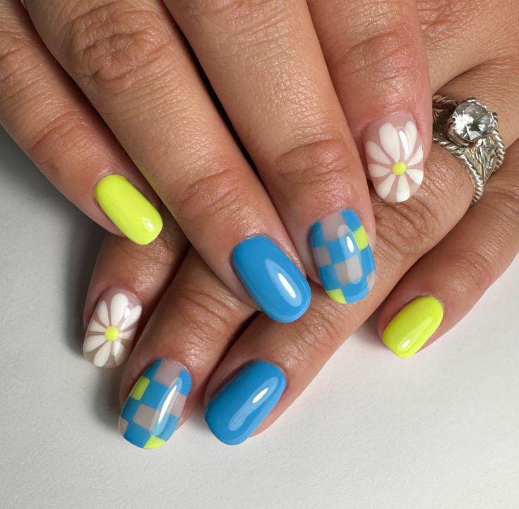 Soft blue and neon yellow gel nails are paired with white bold daisies and subtle checkered nude accents. The design feels playful and retro-inspired, capturing a bright and breezy summer aesthetic.