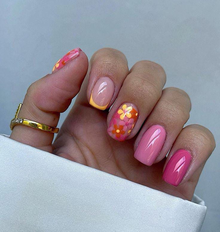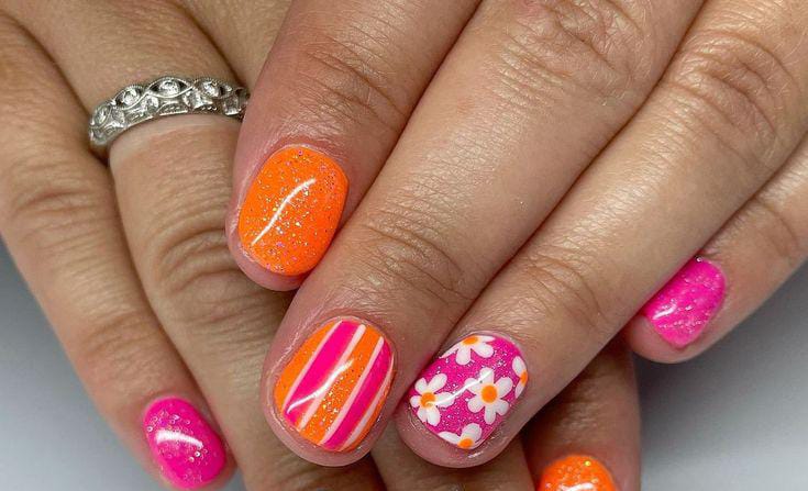 Hot pink and orange gel nail shades are blended with stripes, tiny florals, and a hint of shimmer. The look is bold, lively, and full of summer warmth, perfect for a fun statement manicure.