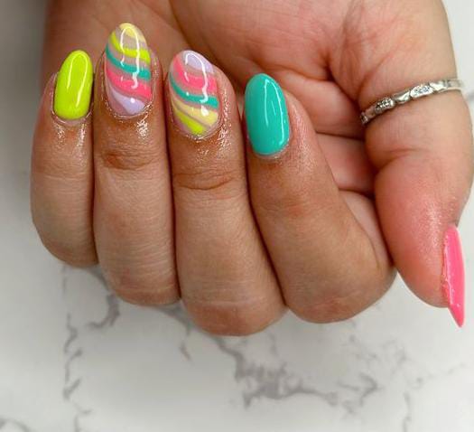 This design mixes bright neon gel nail shades in yellow, turquoise and nuse with soft, flowing swirl patterns for a fun, energetic summer look. The glossy finish and playful color contrast give it a bold, beach-ready vibe that feels fresh and modern.
