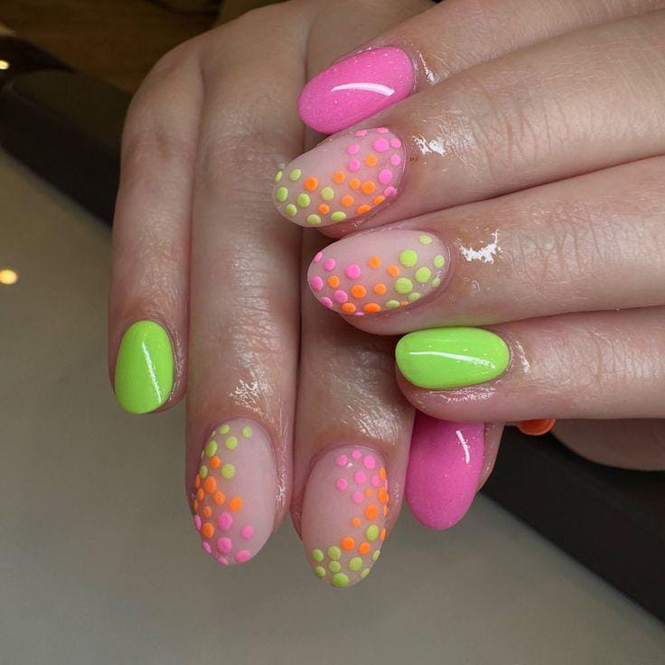 Soft nude bases are paired with vibrant neon dots in pink, green, and orange for cheerful, tropical gel nails. The look is light, playful, and perfect for summer days when you want color without heaviness.