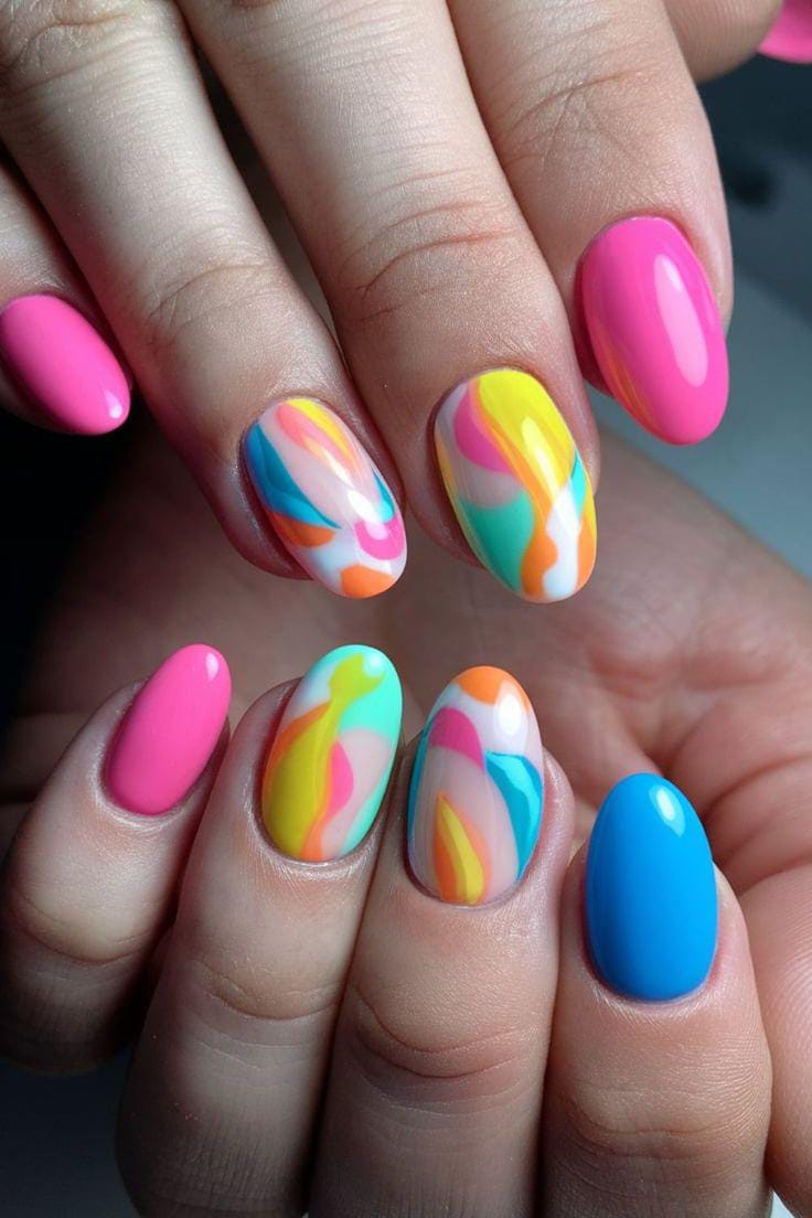 These gel nails design features smooth, marbled waves of pink, yellow, blue, and orange that blend effortlessly together. The glossy finish and fluid patterns create a dreamy, artistic summer aesthetic.