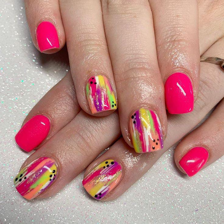 Bold pink gel nails are paired with abstract brushstroke in yellow, purple, green, peach and black dots accents in neon summer shades. The mix of artistic streaks with glitter and glossy color gives this design a fun, confident, and statement-making look