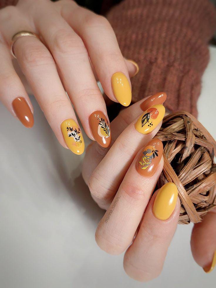 Warm mustard yellow and caramel brown gel nail tones create a cozy yet stylish summer palette. The delicate botanical black leaves and dots details give this set an earthy, artistic feel that’s both trendy and elegant.