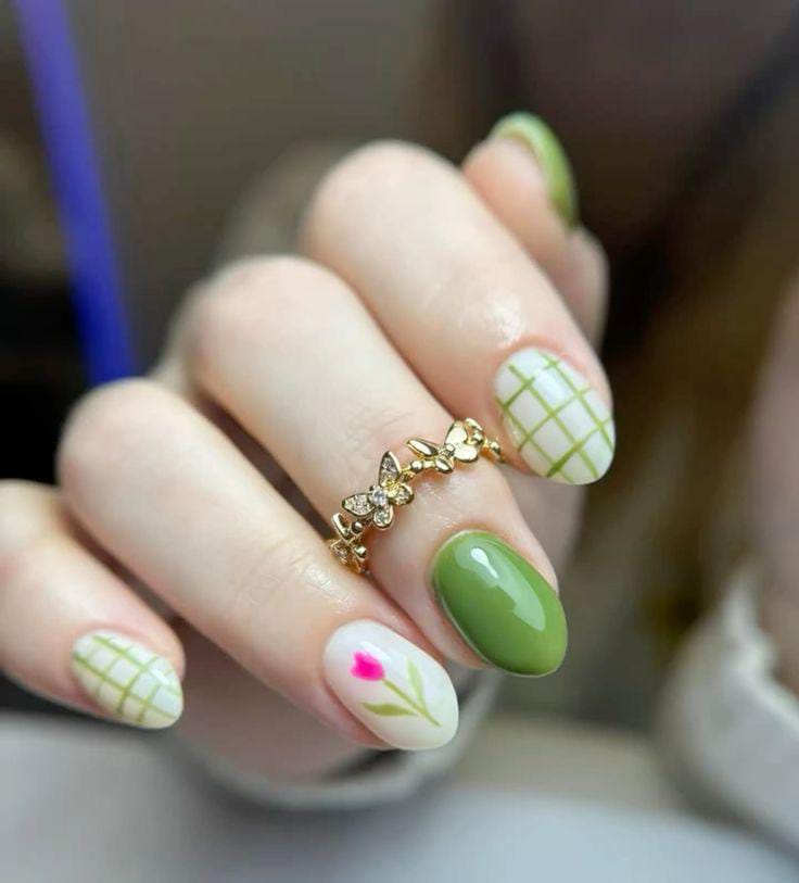 Soft green and creamy white gel nail shades bring a calm, nature-inspired look. The subtle grid pattern and tiny floral accent make the design feel clean, modern, and effortlessly summery.