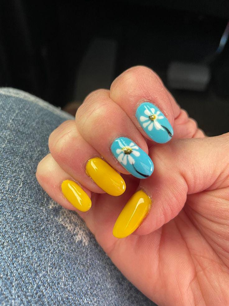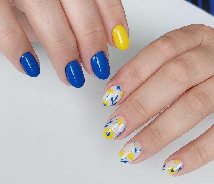 Deep blue and sunshine-yellow gel nails are paired with soft floral art on a milky nude base, creating a fresh and airy summer look. The balance of bold solids and delicate patterns makes it feel cheerful yet polished.
