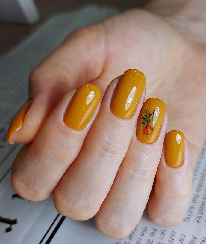 Rich mustard gel polish gives this set a warm, glossy finish. The small floral detail adds a gentle feminine touch, making the overall look simple, polished, and summer-ready.