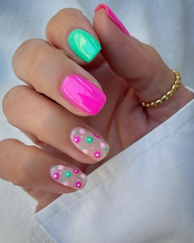 Bright neon pink and mint green gels are paired with translucent floral accent nails for a playful, modern look. The mix of bold color and cute floral details gives this design a fun, youthful summer energy.