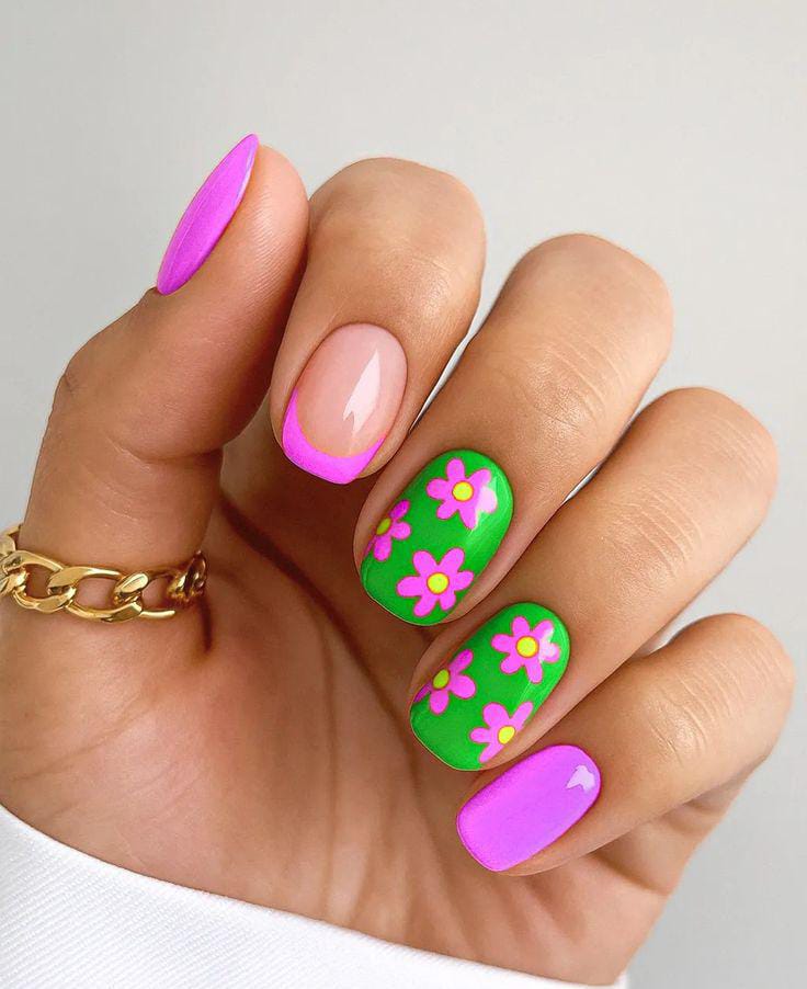 Bright green and bold pink gel tip nails are paired with playful flower patterns for a fun, retro-inspired style. The colors feel energetic and cheerful, giving off strong summer festival vibes.