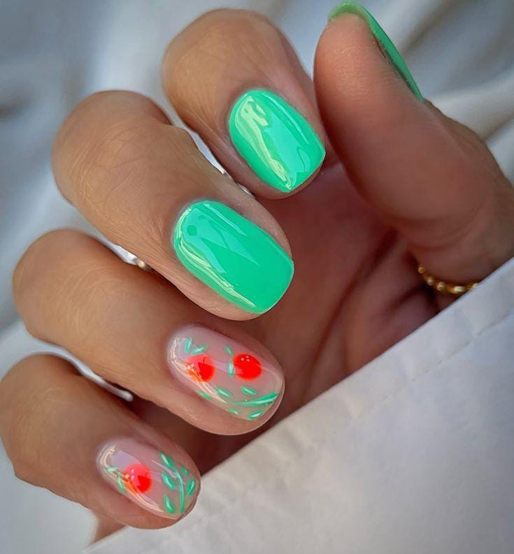 Glossy mint-green gel nails are balanced with clear accent nails featuring soft red floral and leaf details. The design feels refreshing and youthful, like a cool summer breeze.