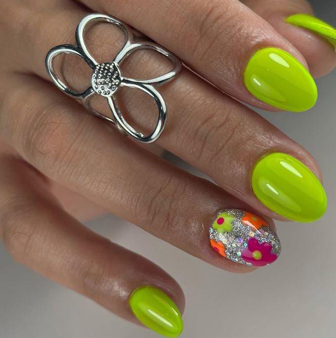 Neon lime gel nails steal the spotlight alongside a glittery floral accent nail. The bold color and sparkle create a playful, statement-making summer vibe.