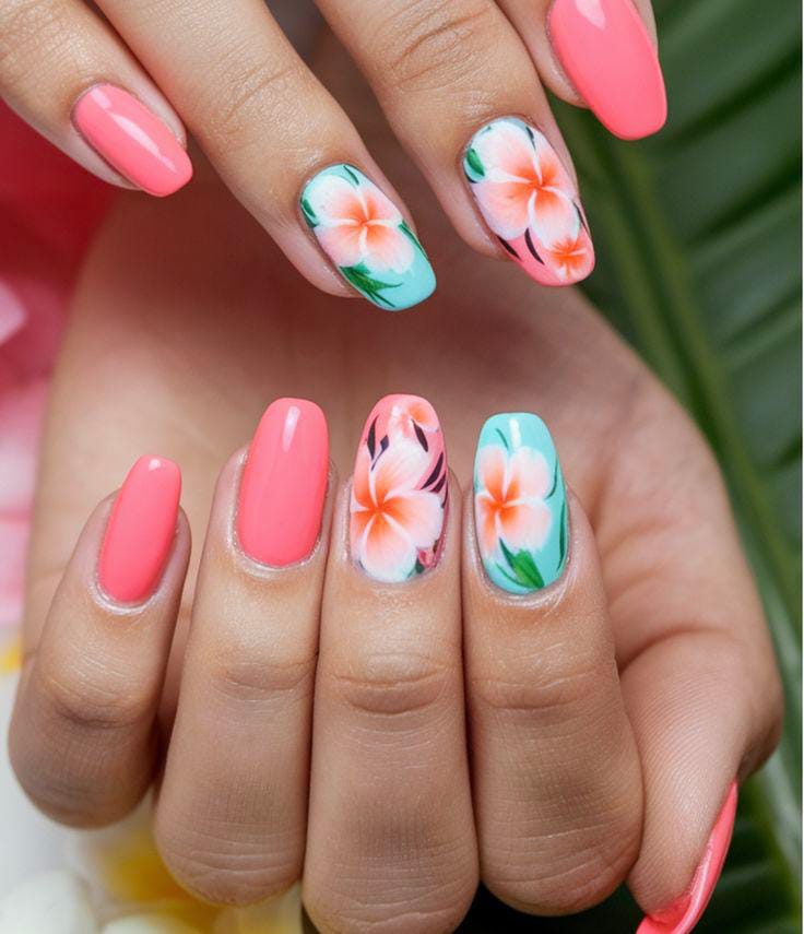Bright coral gel nails are paired with fresh floral artwork in soft tropical shades. The design feels lively and beachy, giving off strong summer vacation energy.