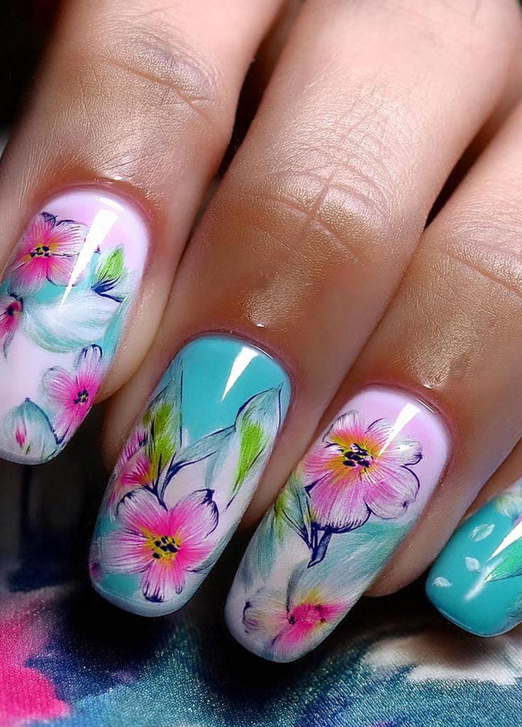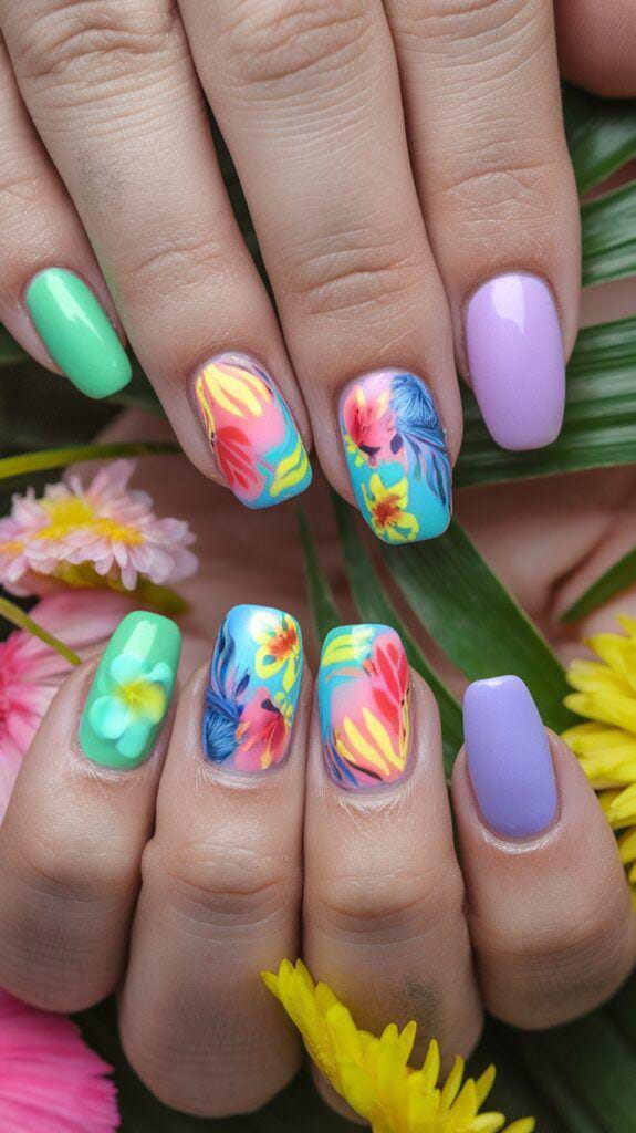This look mixes bold pastel solids in mint, lavender and lilac gel nails with vibrant hand-painted floral designs. It feels playful, artistic, and full of summer freshness, like a blooming garden.