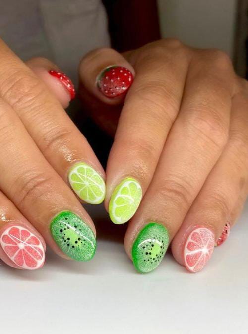 This look highlights detailed citrus, kiwi and strawberry fruit designs in fresh greens, pinks, and coral. The glossy gel finish and juicy patterns give it a bright, refreshing summer energy.