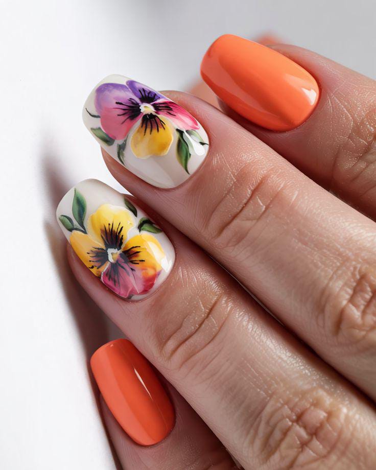 This design mixes bright coral gel nails with soft white accent nails featuring hand-painted pansy flowers and leaves. The bold base color keeps it vibrant, while the floral art adds a fresh, garden-inspired summer vibe.