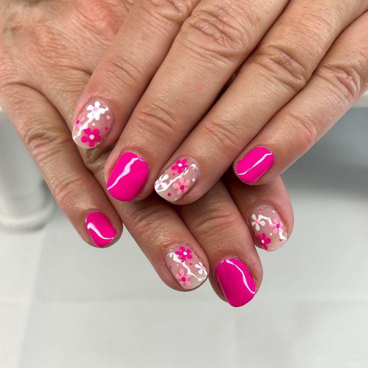 A playful combination of hot pink gel nails and sheer nude accents decorated with tiny floral and dot patterns. The look feels light, glossy, and youthful — perfect for a fun, carefree summer mood.