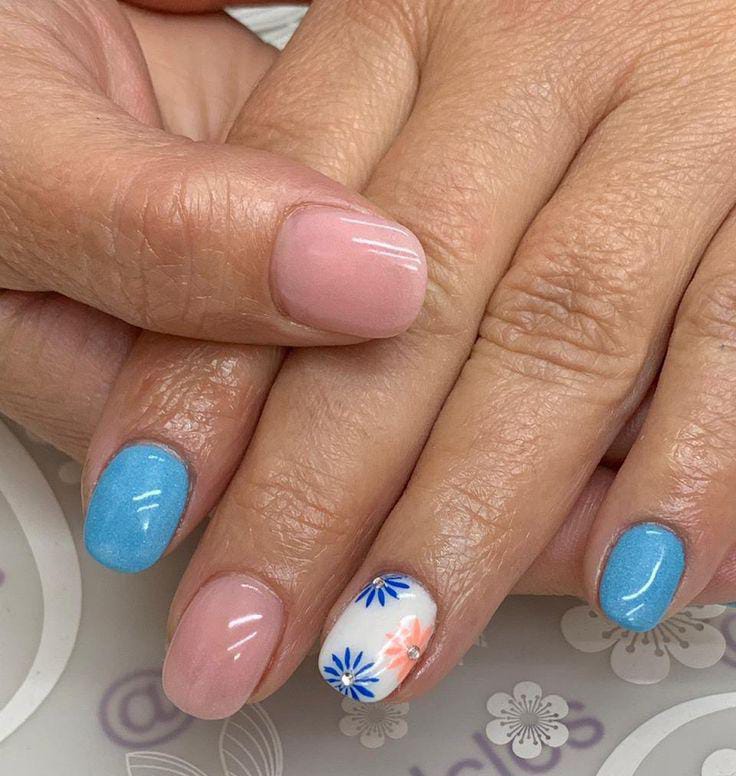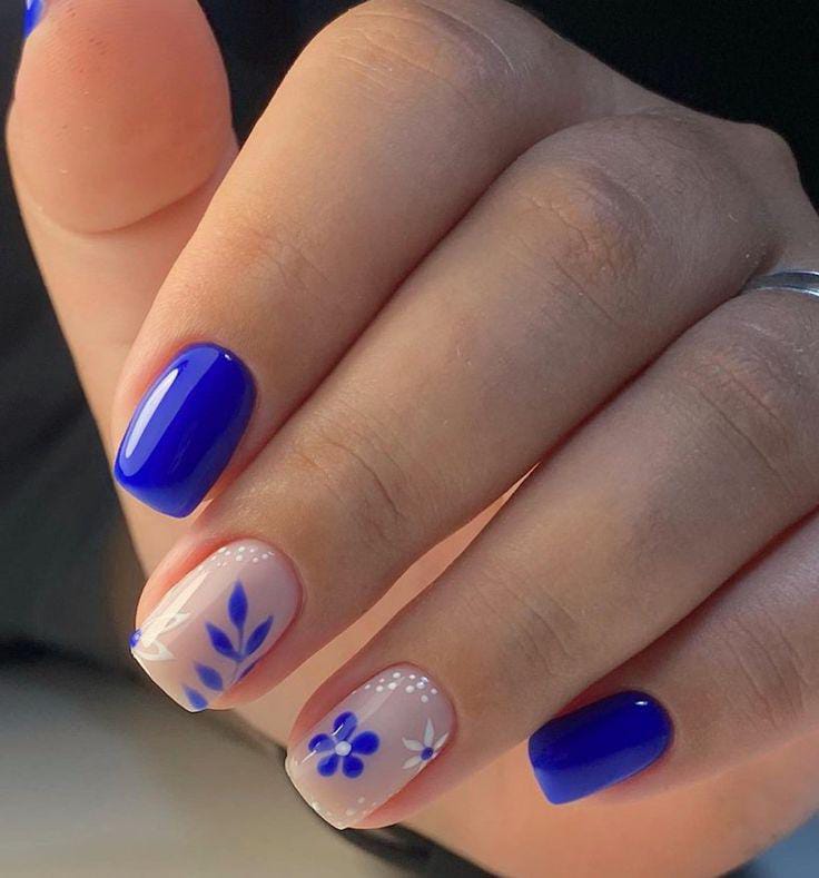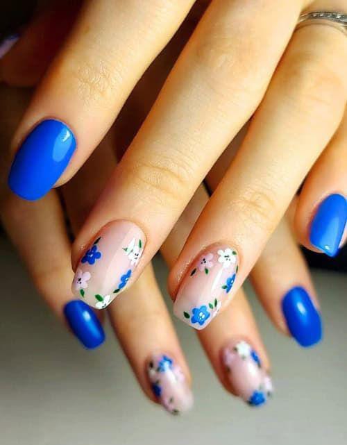This style pairs vivid royal blue gel nails with neutral bases covered in small blue and white flowers. It has a clean, breezy feel that balances bold color with soft floral summer charm.