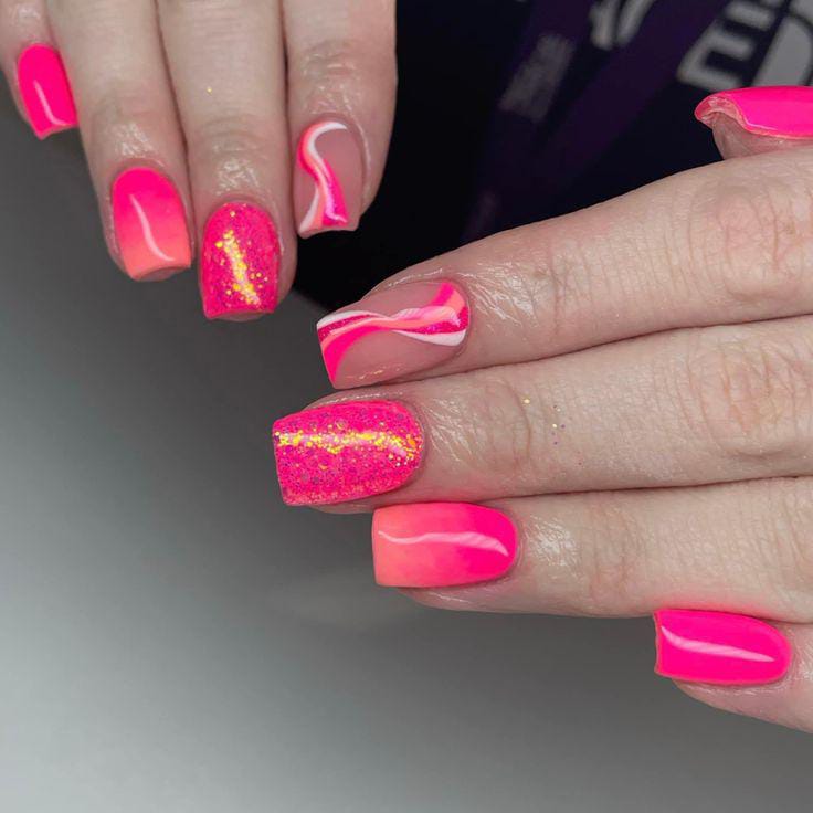 Bright neon pink gel nails are mixed with abstract swirl nude accents and a touch of glitter for extra sparkle. The overall vibe is bold, energetic, and perfect for summer nights or vacations.