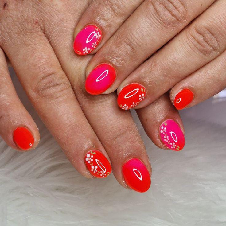 This design features bold coral and hot pink gel ombre tones that feel bright and energizing. Small white floral accents add a playful, summery charm without overpowering the vibrant base.