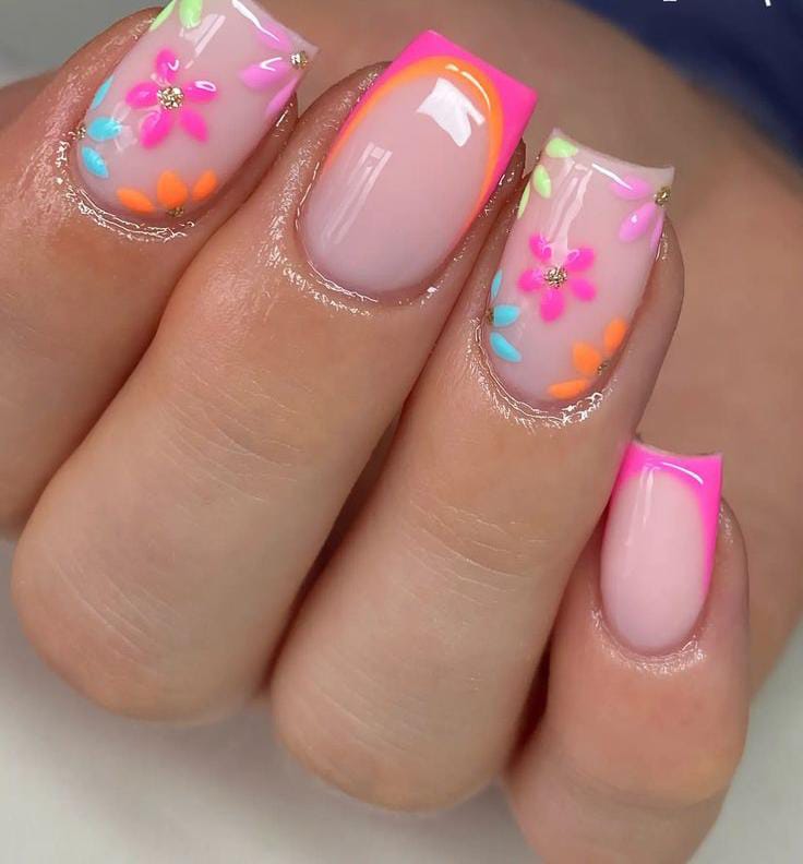 This soft nude gel base with neon pink tips and colorful floral and shimmer center details for a fun, modern twist. The bright accents make the design feel bold, cheerful, and perfect for summer days.