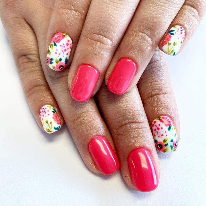 Glossy hot pink gel nails are paired with floral-patterned white accent nails for a lively, feminine look. The mix of solid color and detailed florals creates a fresh, garden-inspired summer style.