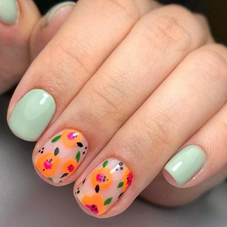 This design mixes soft mint green with sheer nude gel nails decorated in bright pink and orange florals. The hand-painted flowers give it a fresh, playful summer vibe that feels light and cheerful.