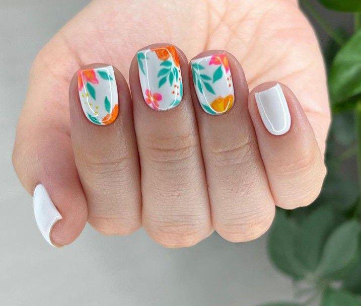 Creamy white gel nails are paired with colorful floral, dots and leafy accents in warm orange, mint, and pink tones. The overall look feels clean yet lively, like a breezy tropical summer getaway.