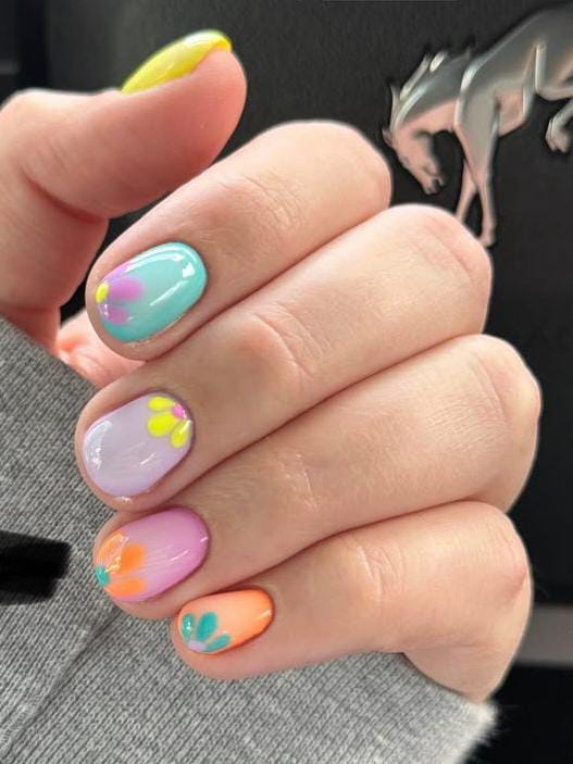 Soft pastel shades like mint, lavender, peach, and baby pink ombre gel nails create a fun, youthful base. Simple floral details add a cute, carefree summer mood without feeling too busy.