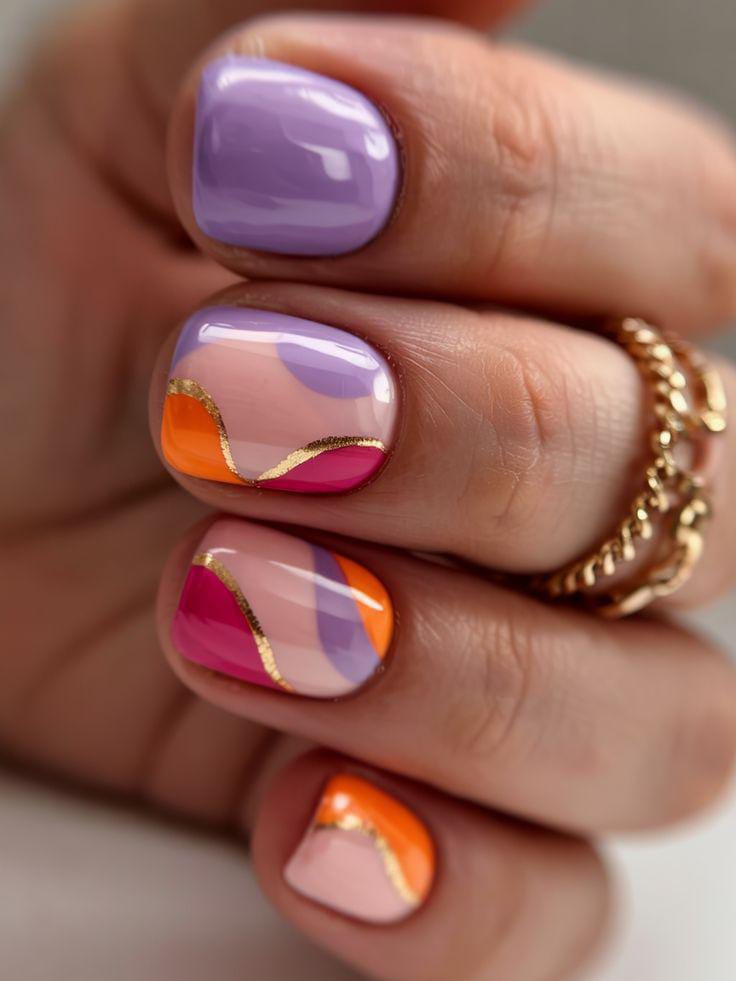This design features lavender, orange, pink, and sheer nude in smooth abstract sections outlined with thin gold accents. It feels modern and elegant, inspired by warm summer sunsets with a glossy gel finish.