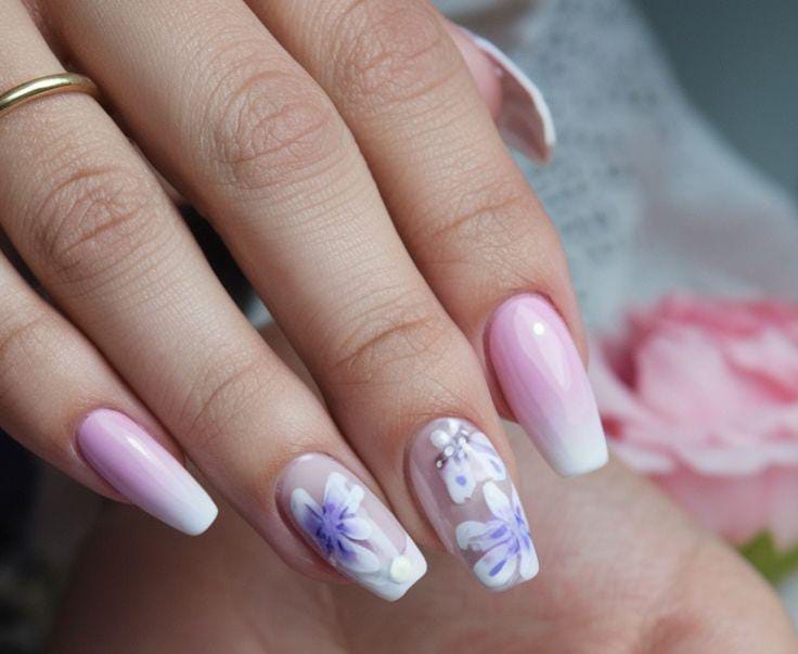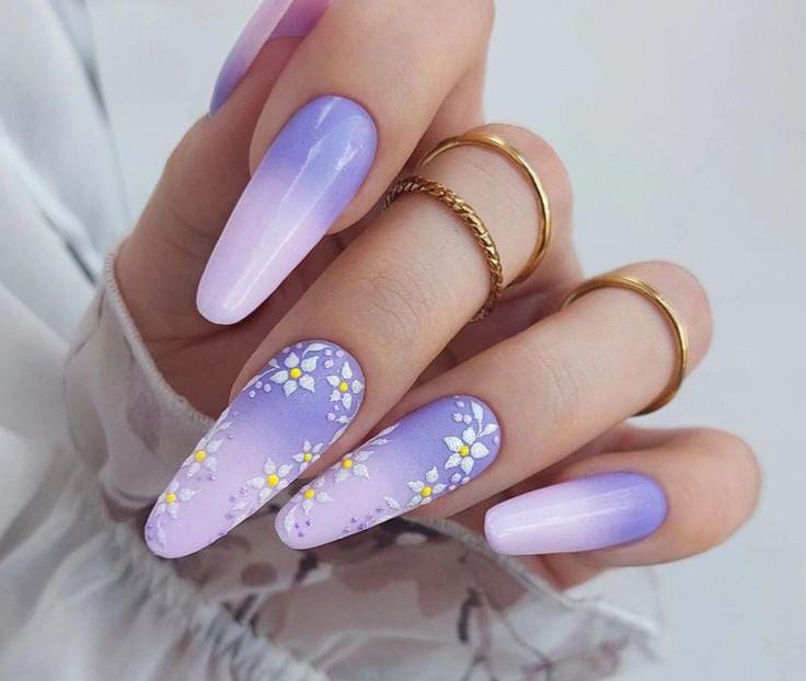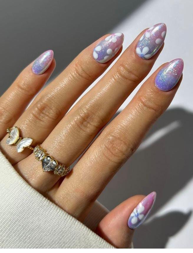 These nails blend lavender and soft purple ombre with a subtle shimmer and white flower details. The style feels dreamy and elegant, giving off a calm yet magical summer vibe.