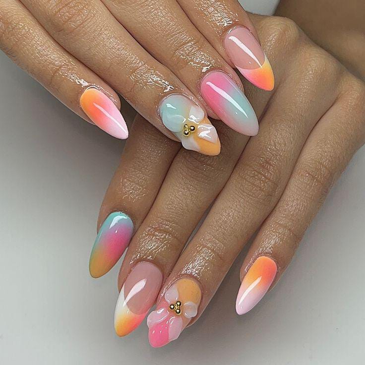 Soft pastel ombre fades across each nail in gentle shades like mint, baby blue, pink, and orange. Tiny 3D floral and gold studs accents add a sweet, spring-to-summer vibe that feels light, fresh, and playful.