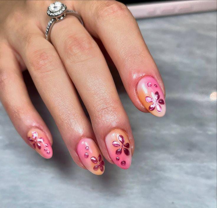 This design uses warm pink-to-peach and nude ombre tones paired with gem-like dots and floral accents. It has a glamorous summer vibe, balancing softness with sparkle for a polished look.