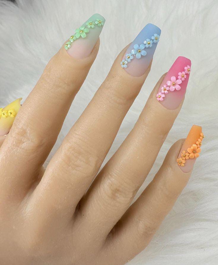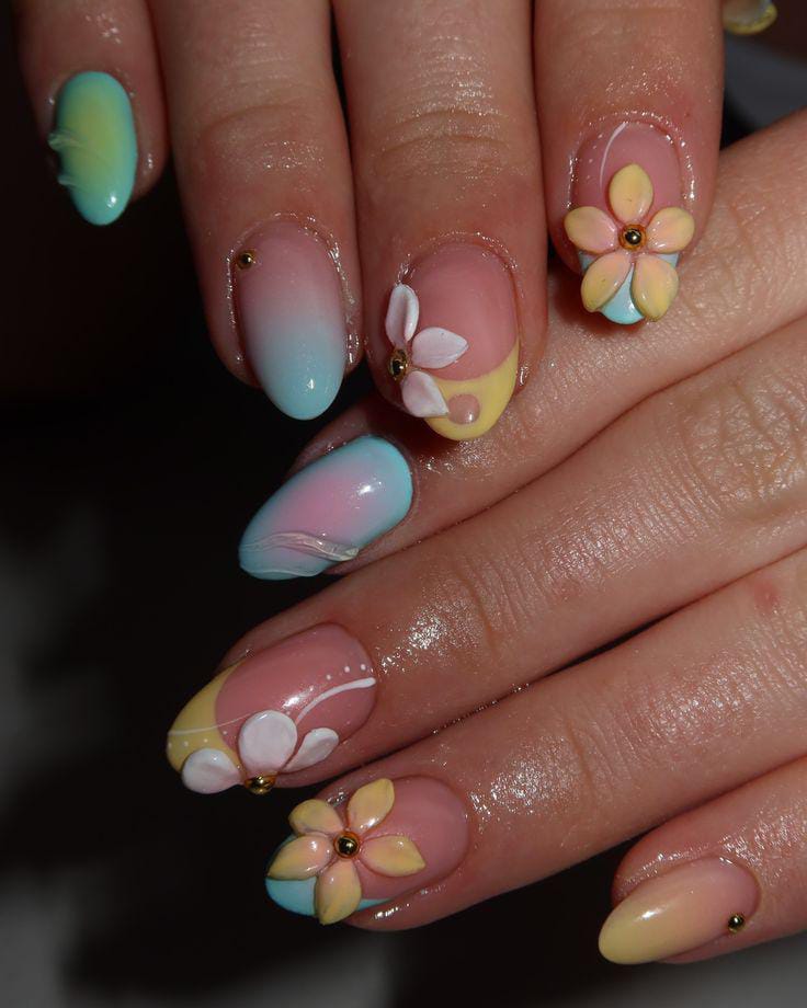 Gentle pastel ombre gradients in blue, mint, nude and yellow tip flow across each nail, topped with delicate 3D flowers and small gold studs. The overall look is sweet, airy, and very spring–summer friendly.