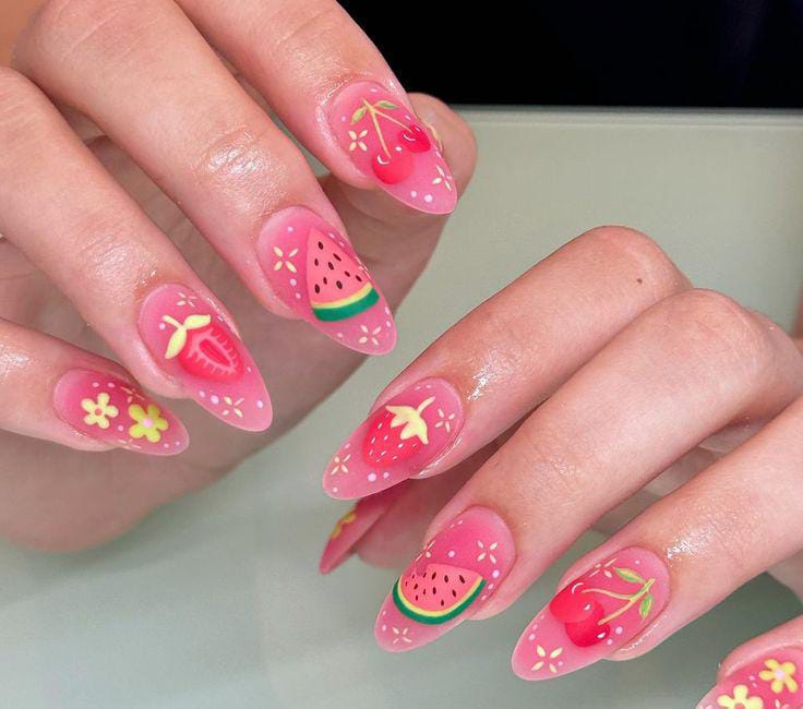 Bright pink ombre nails are decorated with cute fruit art like strawberries, cherries, and watermelon slices. Delicate floral, dots and star details. The vibe is bold, fun, and youthful — perfect for sunny days and vacation summer moods.