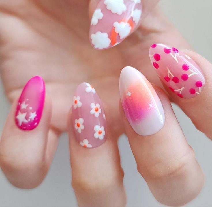 This design features soft pink to white ombre nails with playful floral, cherry, clouds and stars accents. The overall vibe is cute, fresh, and feminine — perfect for a lighthearted summer look.
