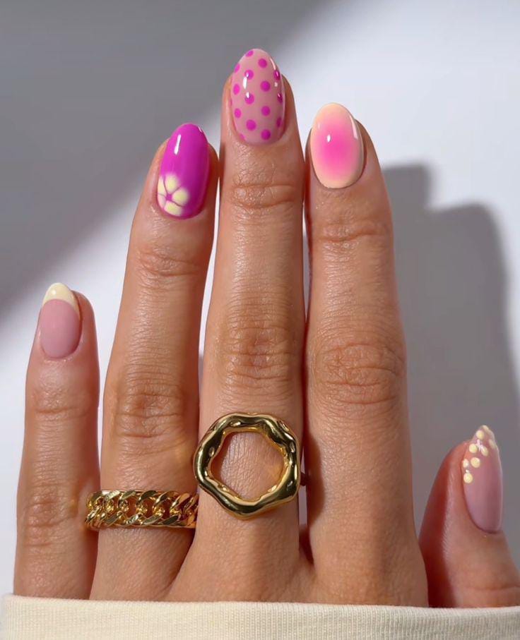 A nude tip and bright pink-to-yellow ombre sets the base paired with fun dots and a simple flower accent. It feels cheerful and minimal summer aesthetic, with a bold pop of color balanced by clean, glossy finishes.