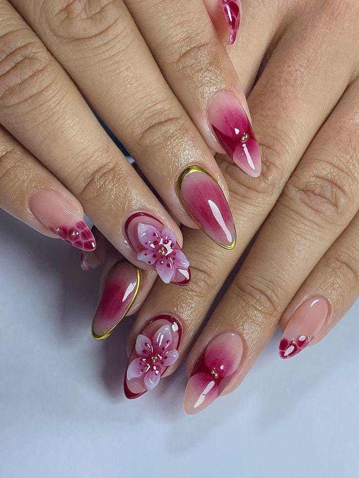 Deep berry mehrun tones fade into soft nude, highlighted by delicate 3D-style floral art and subtle gold outlines and studs. This look is romantic and slightly glam, perfect for dressed-up summer occasions.