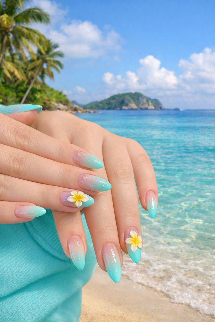 A refreshing aqua-to-nude ombre pairs beautifully with small tropical yellow flower accents. The design feels beachy and relaxing, giving major vacation summer energy with its bright, ocean-inspired colors.