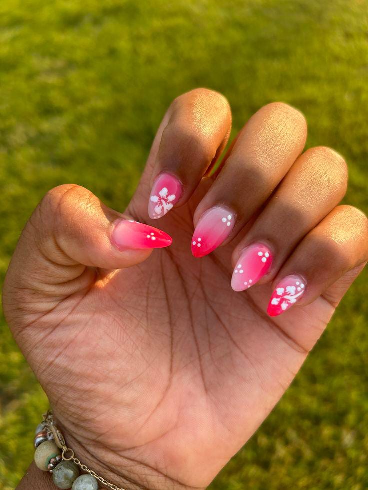 This design features a hot-pink to nude ombre with delicate white floral details and dotted accents. It has a bright, cheerful summer look that feels fun yet feminine.